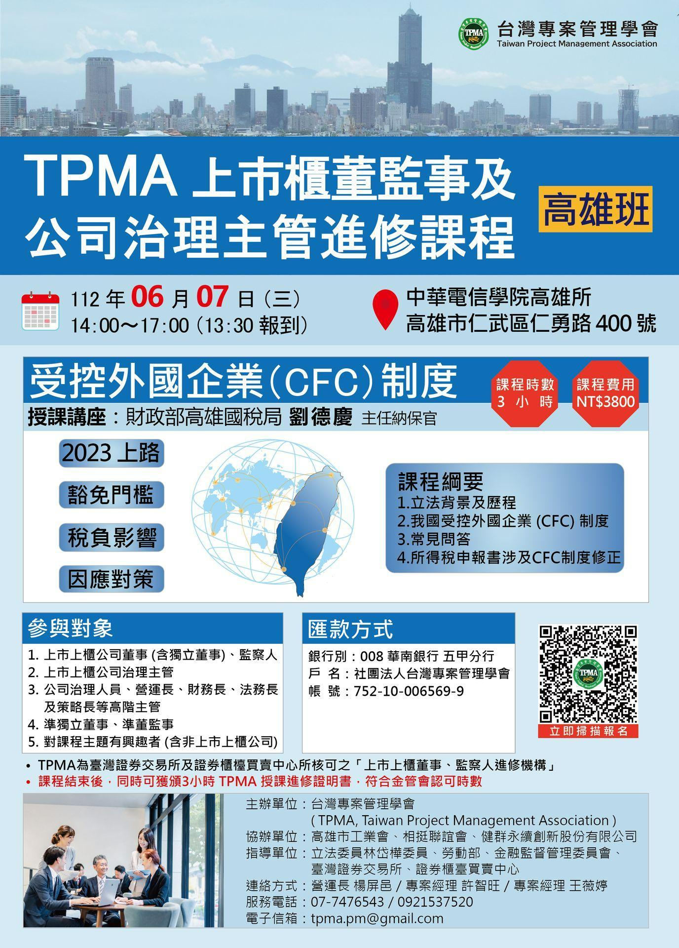 受控外國企業(CFC)制度今年元旦上路,該制度涉及家族企業常設於境外投資公司,轉投資或控股家族企業之投資型態,將產生重大稅負影響。台灣專案管理學會(TPMA )六月將邀請高雄國稅局主任納稅者權利保護官開班授課,歡迎上市櫃董監事、公司治理主管和有興趣者報名參加。