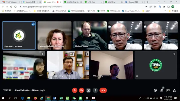 台灣專案管理學會 ( TPMA ) 依循IPMA規範,於2022年3月29日至4月1日連續四天,由 TPMA 認證委員會主任委員 李仟萬先生 ( 國家首席評估師 NFA ),帶領認證委員會副主任委員 歐陽彥晶教授、計畫委員會主任委員 黃祥熙教授、認證評估師 盧文民教授、資深專案經理 許智旺、蘇秋皇及相關委員,配合IPMA CVMB ( 認證機構 ) IPMA – Lead validator - Margarida Gonçalves ( 瑪格麗達 貢薩爾維斯 ) 及 Co-validator – Michael Young ( 邁克爾·楊 )等二位國際驗證評估師進行三年一次的ICR4認證規範驗證,並經686項驗證順利通過IPMA ICR4 認證品質肯定。